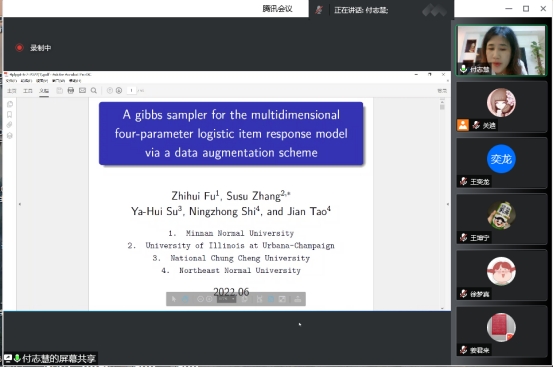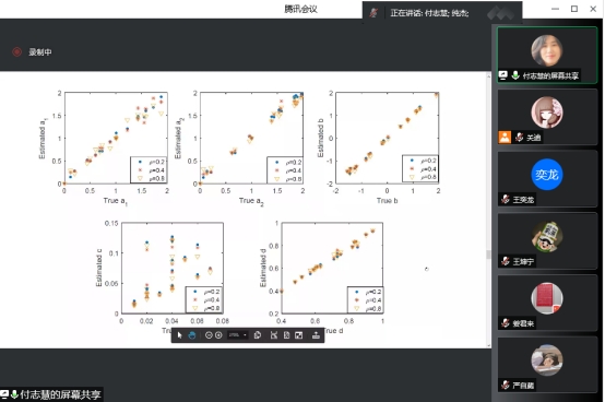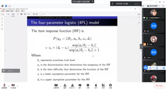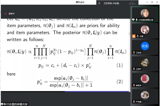 在这个特别的日子里,付志慧教授全面系统地给我们分享了四参数Logistic模型的Gibbs抽样方法。主要讲解模拟研究、实际案例部分,引发了同学们浓厚的学习兴趣。一方面巩固了同学们关于抽样方面的知识,另一方面让同学们对此方向的学习有了更明确的思路以及规划。在报告尾端,老师同学们和付志慧教授针对报告的内容展开了激烈的探讨。在场师生均表示聆听本次报告受益匪浅,收获颇多。