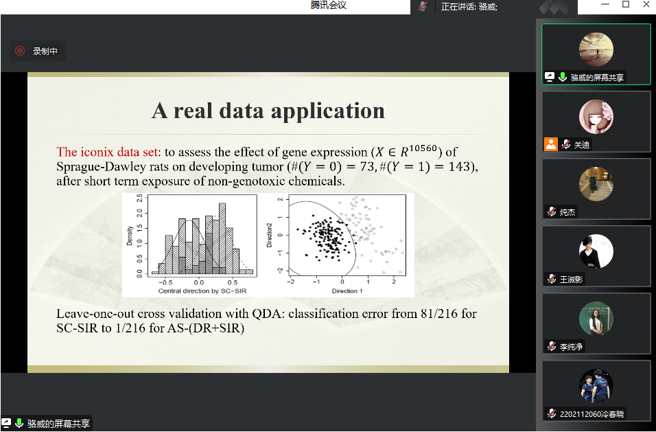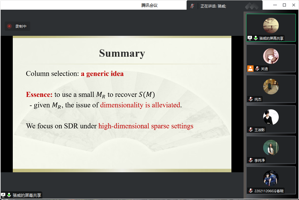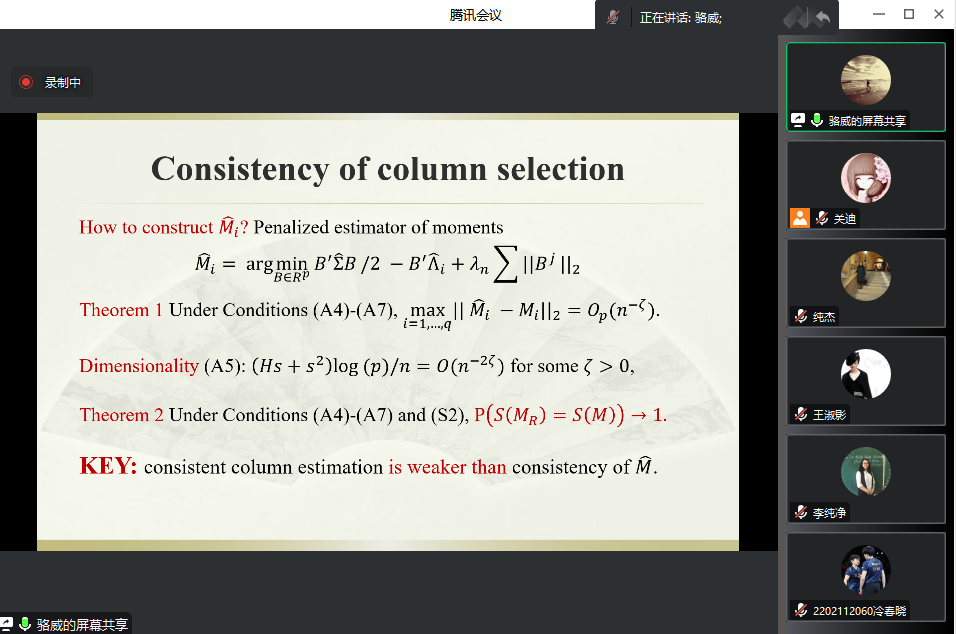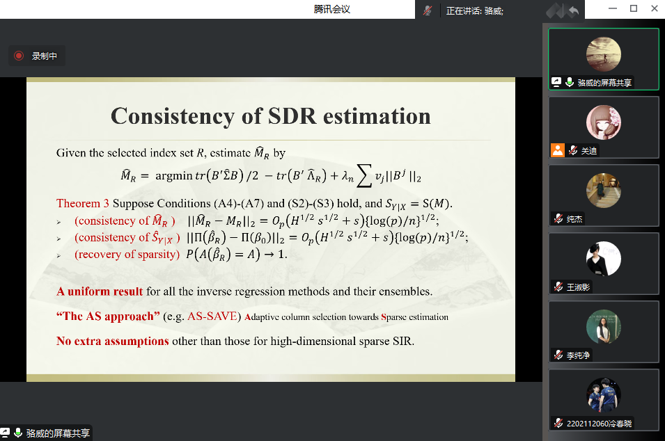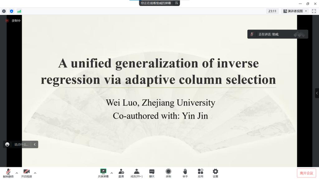 (通讯员:关迪)为了扩展学生的专业思维,提升专业知识的理论学习水平,2023年3月29日上午10:00,由必赢线路检测中心主办的报告——“A unified generalization of inverseregression via adaptive column selection”在腾讯会议线上举行,特别邀请骆威老师作为主讲人,基于骆威老师本人的研究以及工作经历,为我校师生进行讲解,我院共有160多名师生前来参会讨论与学习。我院必赢线路检测中心院长王纯杰、副院长李纯净、统计系主任杨凯、统计系副主任王淑影等学院部分老师、研究生参加了本次学术报告会,会议由必赢线路检测中心院长主持。