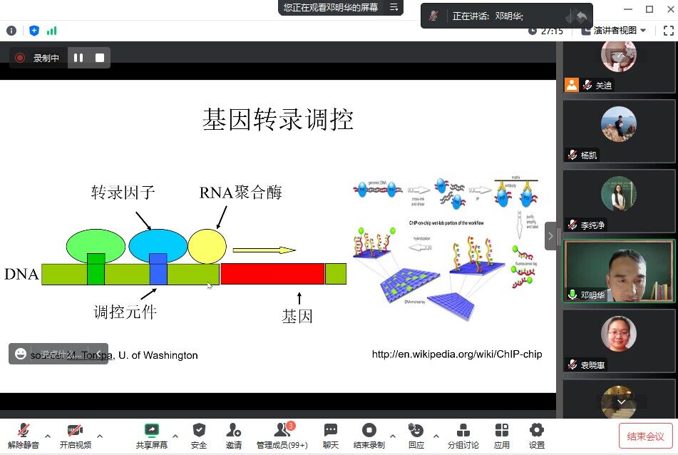 邓明华教授向同学们介绍了自编码器、单细胞RNA测序(scRNA-Seq)和已有的scRNA-Seq聚类方法,并用图示的方法,进一步清晰地向同学们展示聚类效果比较和选择高方差基因、自训练策略提高了聚类效果。然后清晰且简洁地给同学们总结了scziDesk。