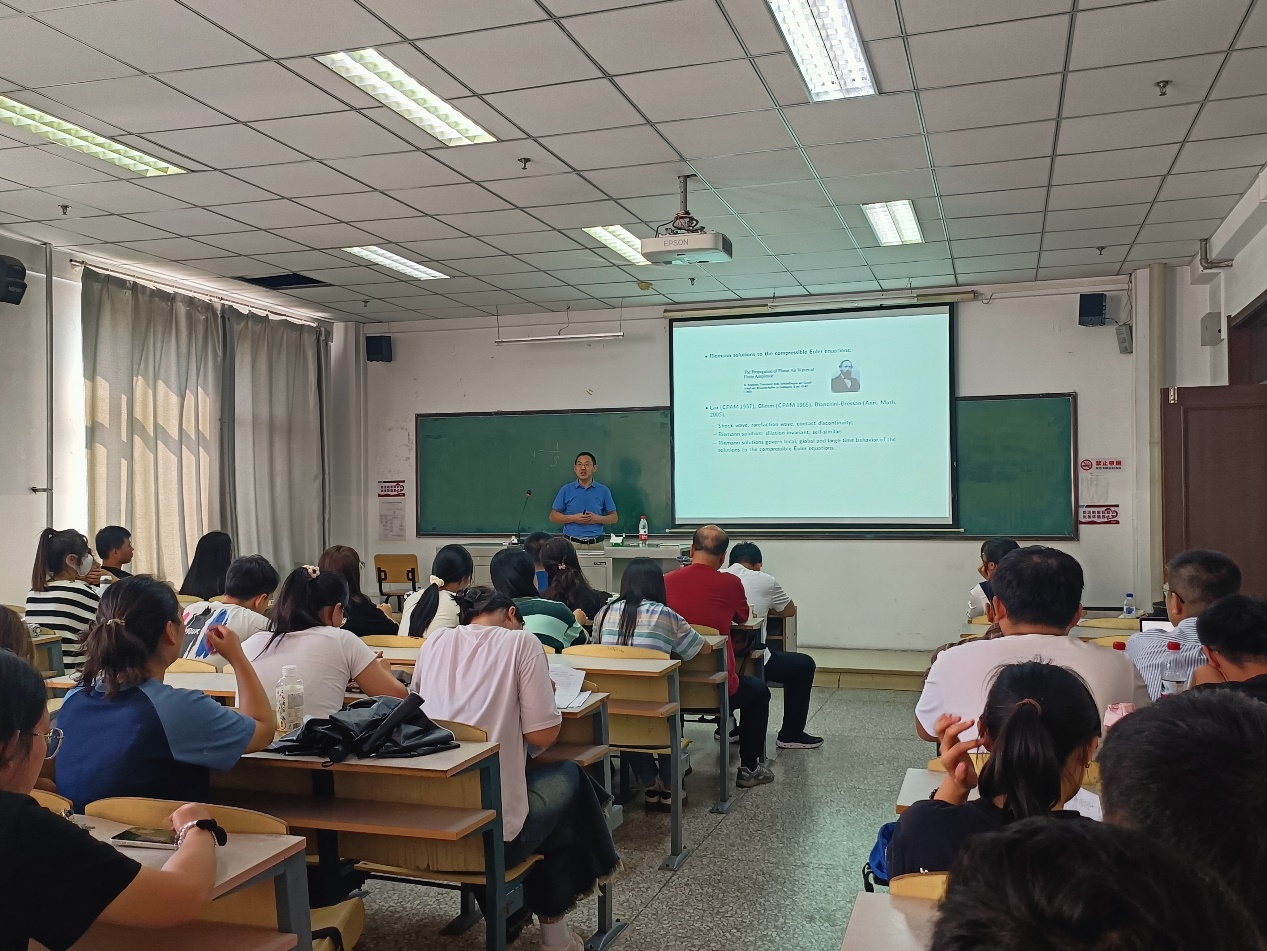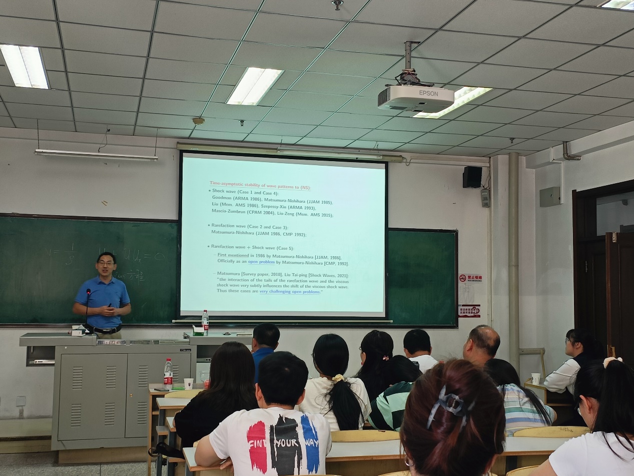 在报告中,王益教授首先从可压缩Navier-Stokes方程组的结构出发,结合生活中的实例描述了所研究问题的物理背景,介绍了相关问题的研究背景及数学家们奋战科研的励志故事,讲解了一维可压缩Navier-Stokes方程组的初值问题随着时间渐近地收敛到可压缩Euler方程组的黎曼问题的思想方法和技术路线。最后,王益教授提倡参会的研究生学习数学家们刻苦钻研、持之以恒的科研精神。