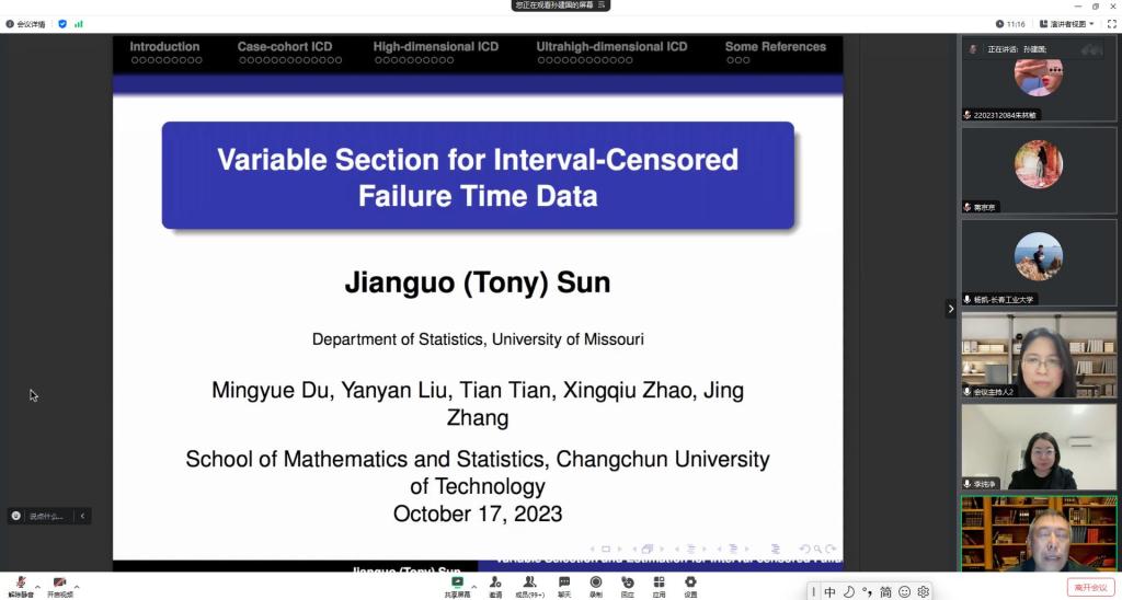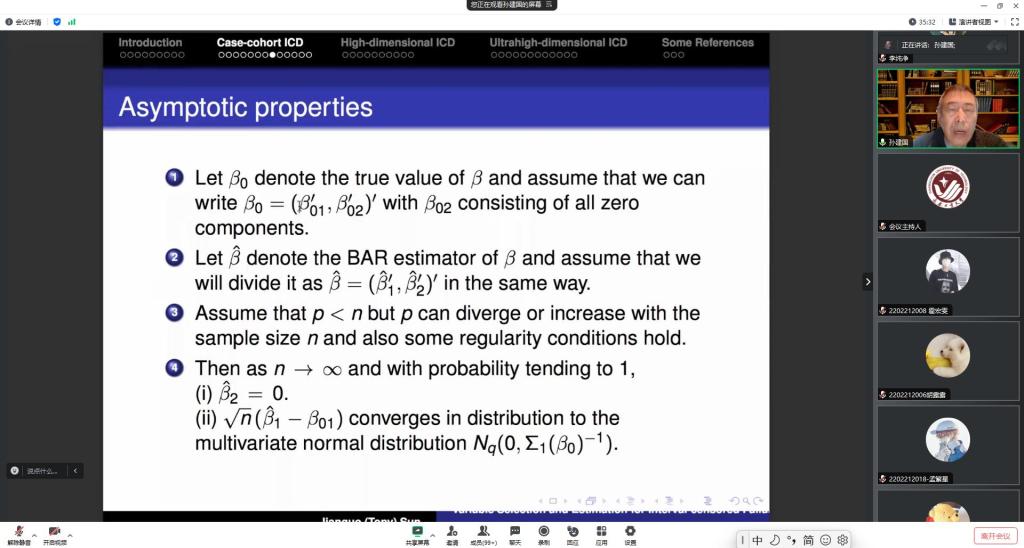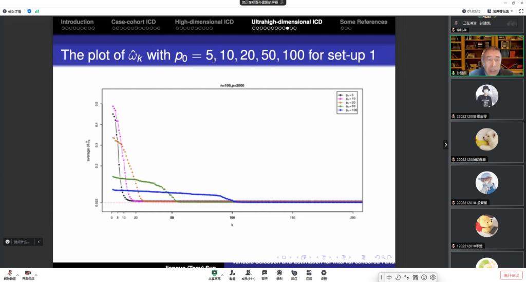 报告会中,孙教授主要介绍了在生存分析问题中关于变量选择问题的处理方法。孙教授基于三类不同模型进行了讲解和阐述:第一个是正常的情况下如何进行变量选择;第二个是在高维具有协变量效应的非参数变量选择问题;第三个是超高维情形下,在变量很难选的条件下如何进行变量的选择。最后,孙教授还介绍了在变量选择时的细节,以帮助大家理解。