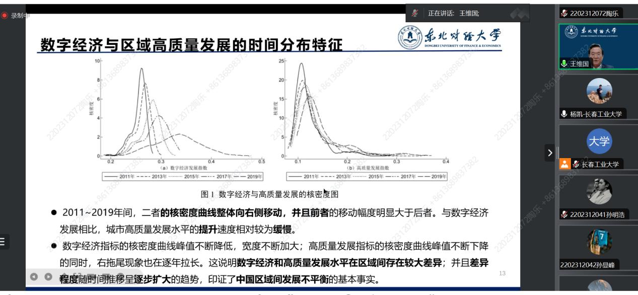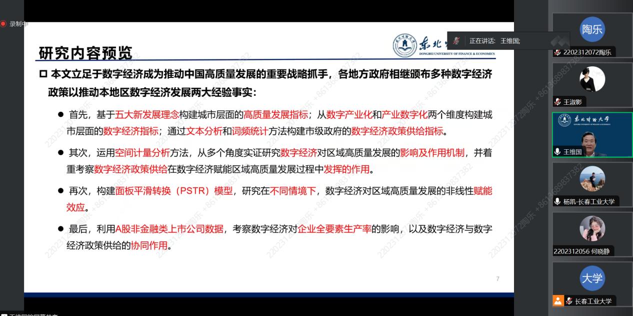 报告会中,王维国教授首先从数字经济的定义切入,基于2011--2019年230个城市的面板数据,提出采用空间计量分析方法从多个维度探究数字经济赋能高质量发展的影响机制。随后王维国教授通过构建PSTR模型,研究在不同情境下,数字经济对区域高质量发展的非线性赋能效应,通过图表让同学们更能直观地了解到数字经济与区域高质量发展的时间分布特征。王教授以严谨的语言表达、条理清晰的讲解方式让同学们了解到数字经济政策对高质量发展的显著影响作用,还从不同的角度,分享了自己的研究经验和学习方法,为我院师生提供了宝贵的参考和借鉴。