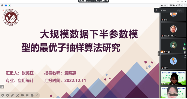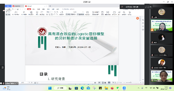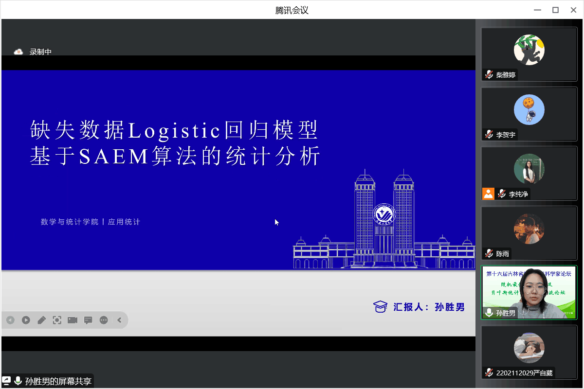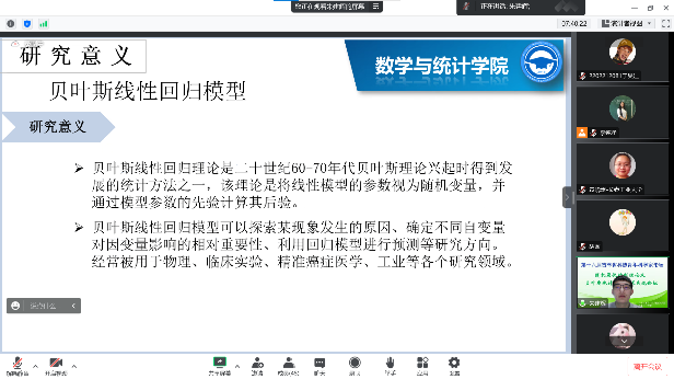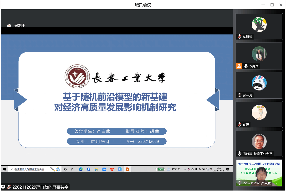 【通讯员 胡茜】20221211日,上午9:30,由吉林省工业与应用数学学会主办,长春工业大学协办的第十六届吉林省科协青年科学家论坛-随机最优控制及贝叶斯统计分析析学术交流论坛”在腾讯会议线上举行。主论坛特别邀请吉林省工业与应用数学学会李勇理事长、东北师范大学郑术蓉教授、吉林大学韩月才教授、吉林大学辛本禄教授、暨南大学王国长教授、北华大学谭希丽教授、吉林大学李天宇副教授、西安交通大学付利亚副教授、闽南师范大学吕阳阳老师、北华大学张继超老师。本次论坛由学院副院长李纯净主持,学院院长王纯杰、统计系主任杨凯、统计系党支部书记袁晓惠、统计系教师孙一芳、李贺宇、胡茜以及部分研究生参加了本次线上青年科学家论坛。
