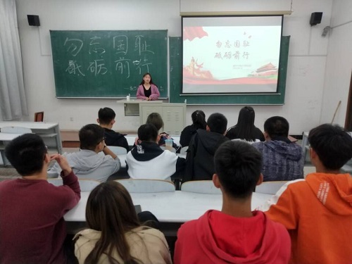 会上,林思扬讲到“九一八”事变中有太多无辜的受害者,妇女、老人、儿童,他们都是我们这个民族深受苦难的承担者。我们要铭记历史,为的不是掀起仇恨,而是为了珍惜现在的安定生活,为维护国家稳定繁荣贡献青年学生的力量。历史不能逆转,但祖国的未来定会更加辉煌。林思扬最后讲到,自新中国建立之后,中国飞速发展,诸多方面成为世界的领头羊,这是靠着是一代一代中国人不懈的努力,更是因为中华民族有着不抛弃,不放弃的优秀品质。作为当代青年大学生,我们更应该继承中华民族的优秀品质,铭记历史,努力学习,扛起时代赋予我们的责任,为祖国的美好明天添砖加瓦。