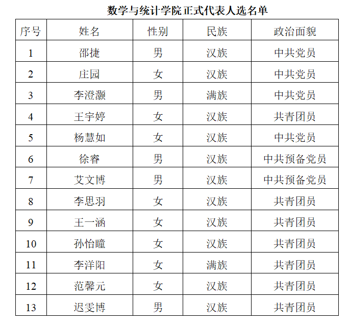 根据《共青团长春工业大学第二次代表大会代表选举工作办法》,经学院团员大会差额选举,现将学院团委选举产生的共青团长春工业大学第二次代表大会正式代表人选进行公示: