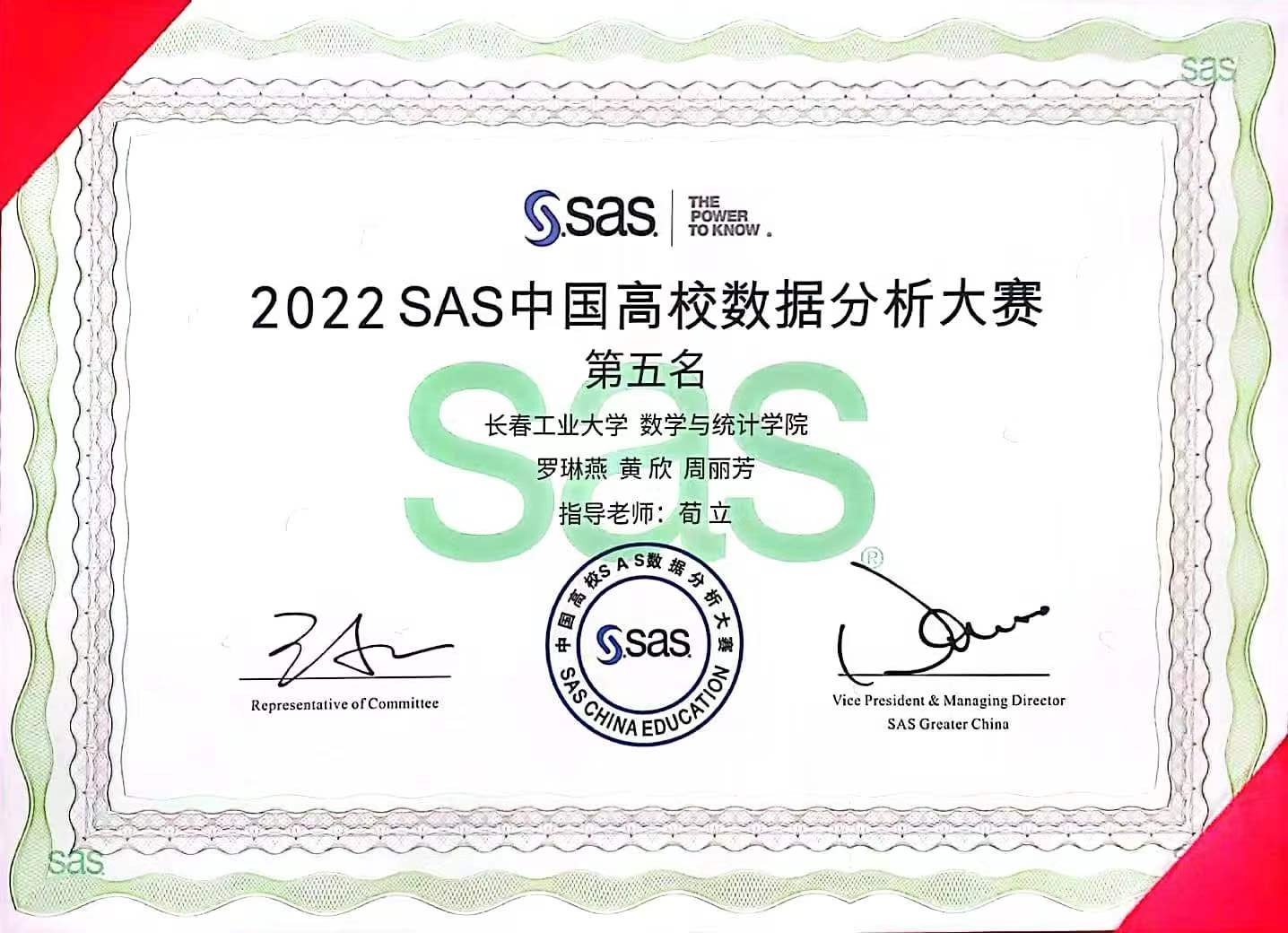 【通讯员屈红雁】2022 SAS中国高校数据分析大赛决赛于2023年4月16日至17日在河南省鹤壁市举行。在本次决赛中,我院共12支队伍入围,并取得了优异成绩。其中罗琳燕、黄欣、周丽芳三位同学组成的飒遍四方代表队更是取得了全国第五的历史最好成绩,为长春工业大学争得了荣誉。此外我院其余代表队也分获一等奖(20强)1项,二等奖(30强)1项,三等奖9项。