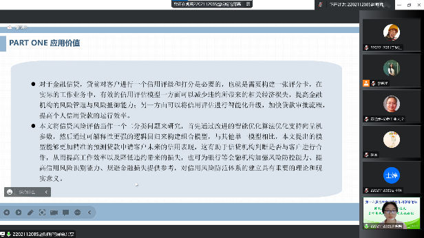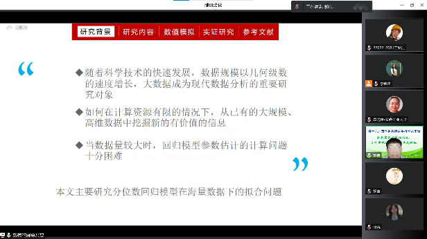 主论坛上,李勇理事长代表学会对论坛的举办表示由衷祝贺,高度评价了必赢线路检测中心近年来快速发展的良好态势,表达了学会对本次论坛的大力支持和高度重视。在各位青年学者进行汇报之前,各位专家开展了热烈讨论交流并进行云合影。分论坛共邀请了23位青年学者进行学术报告,报告分为3个专题,汇报的研究方向有函数型数据研究、贝叶斯统计分析、其他模型与算法的研究等。青年学者积极开展学术报告,各位与会专家、学院院长王纯杰和统计系主任杨凯分别为青年学者进行点评。