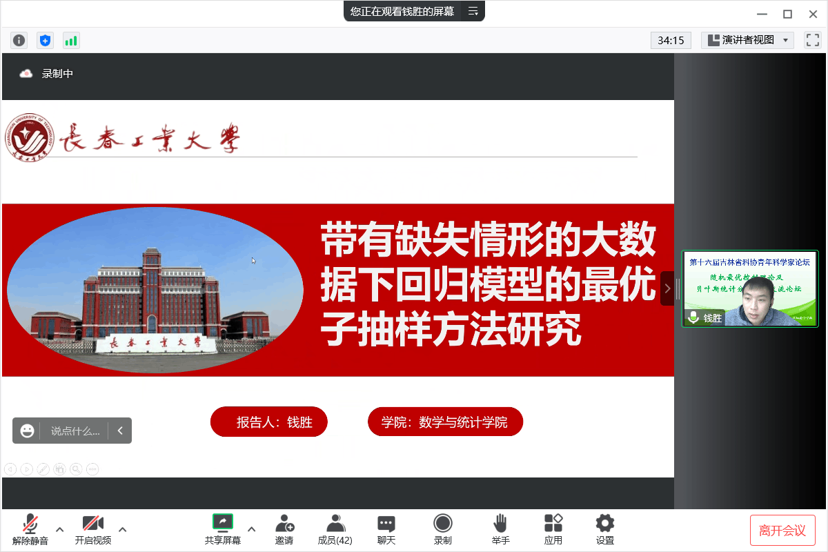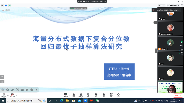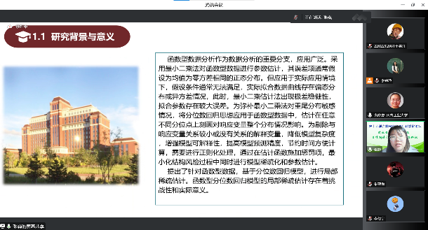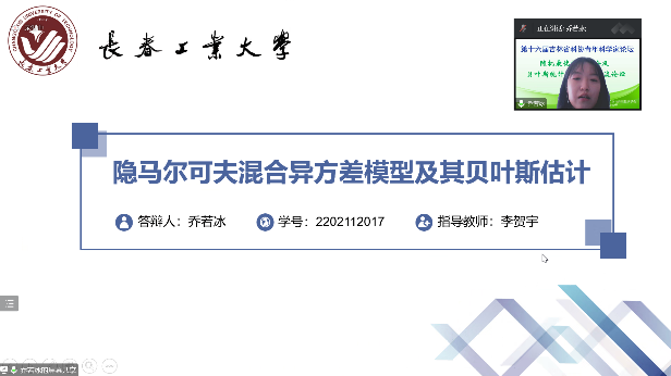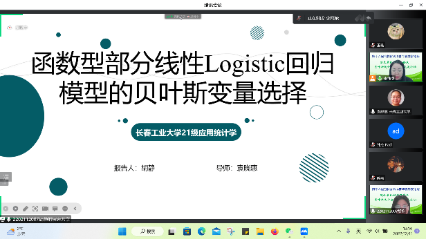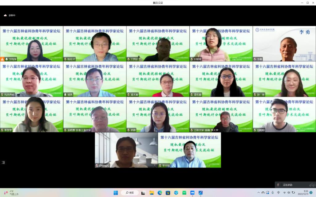 【通讯员 胡茜】2022年12月11日,上午9:30,由吉林省工业与应用数学学会主办,长春工业大学协办的“第十六届吉林省科协青年科学家论坛-随机最优控制及贝叶斯统计分析析学术交流论坛”在腾讯会议线上举行。主论坛特别邀请吉林省工业与应用数学学会李勇理事长、东北师范大学郑术蓉教授、吉林大学韩月才教授、吉林大学辛本禄教授、暨南大学王国长教授、北华大学谭希丽教授、吉林大学李天宇副教授、西安交通大学付利亚副教授、闽南师范大学吕阳阳老师、北华大学张继超老师。本次论坛由学院副院长李纯净主持,学院院长王纯杰、统计系主任杨凯、统计系党支部书记袁晓惠、统计系教师孙一芳、李贺宇、胡茜以及部分研究生参加了本次线上青年科学家论坛。