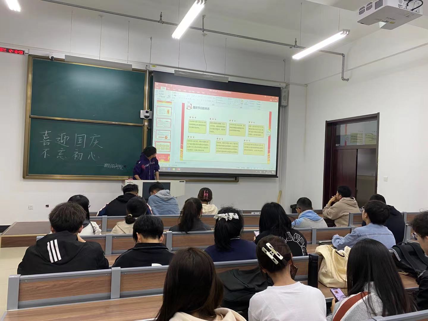 会议开始,颜兴洲为大家介绍国庆节的历史及伟大的祖国在过去72年里的发展历程,组织大家观看新中国建设和发展的影片;在会议上,颜兴洲与各班级团支部委员们共同学习了近代国人经过一百多年的英勇奋战,在中国共产党的领导下,取得了人民革命的伟大胜利,为中国人民谋幸福,为中华民族谋复兴。在1949年10月1日宣告中华人民共和国成立,这是中国历史上一个最伟大的转变,从中国人民站了起来,到现在中国人民强了起来,在庆祝新中国72年华诞之际,观影回顾了新中国的伟大历史、伟大征程、伟大成就,不断地强化同学们不忘初心,牢记使命,坚定信念,勇于担当,努力奋斗,学业报国的爱国情怀。