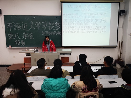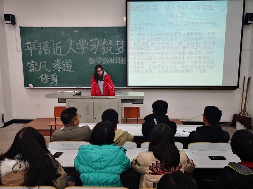 学习会上,宋思晗向同学们简单明了地介绍了中央电视台的系列电视节目《百家讲坛》,该节目以习近平总书记的一系列重要讲话,文章等作为内容,引用古代典籍经典名句作为切入点,生动阐述了习近平新时代中国特色社会主义思想。会上,同学们一起观看了《百家讲坛“平语近人”》节目的第四、五、六期,领悟到“国风之本在家风,家风之本在孝道”的真谛。宋思晗对“天下之本在国,国之本在家”这句话做出了详细的解释,自我管理的好坏直接关系到国家统治秩序及社会的稳定发展,家庭是社会组织机构的细胞,“细胞”出了问题,不仅影响一个家庭的发展,而且还关乎社风民风,乃至民族和国家的命运。最后,她希望同学们能够跟随习近平总书记领导中国传承、发扬中国传统文化精神的步伐,真正成为重家风,重孝道,重修身的新一代优秀青年。